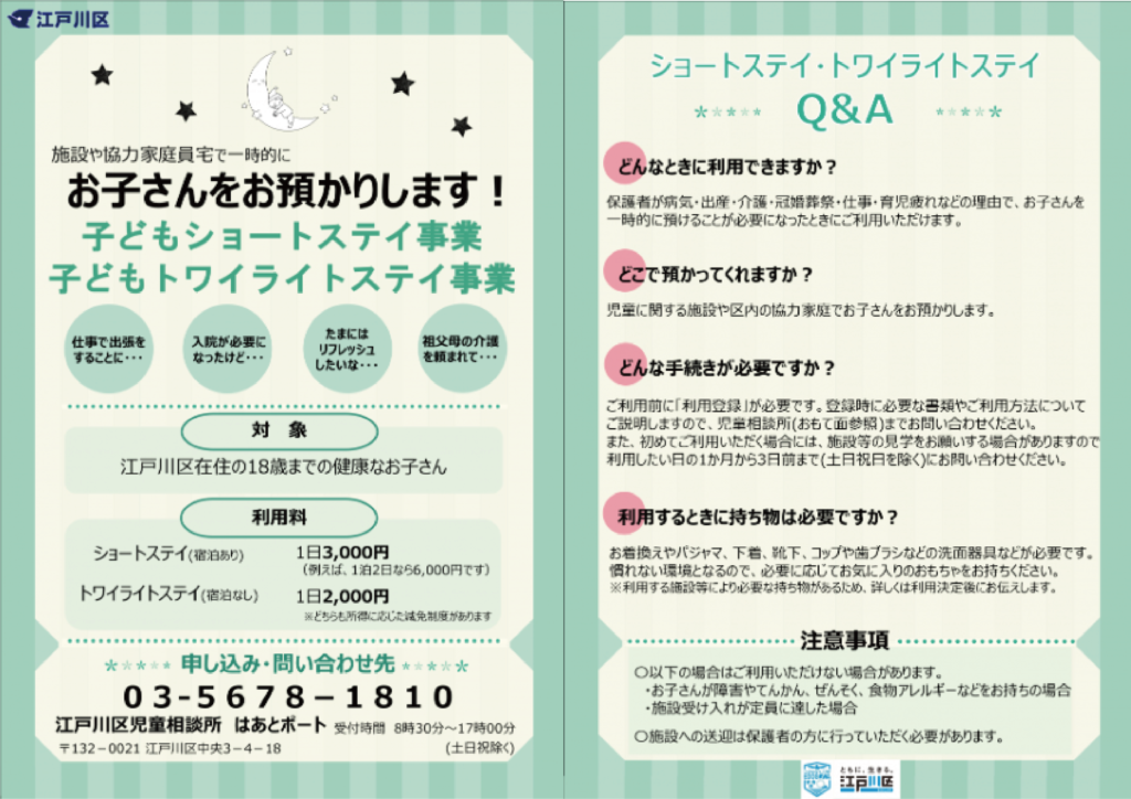 こどもショートステイ事業、正式には「子育て短期支援事業」といいます。
