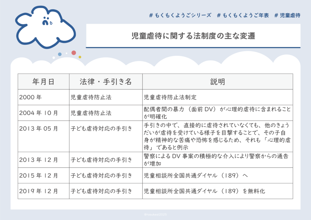 児童虐待についての法律「児童虐待の防止等に関する法律(児童虐待防止法)」ができたのは、じつは2000年。いまから20数年前のことです。