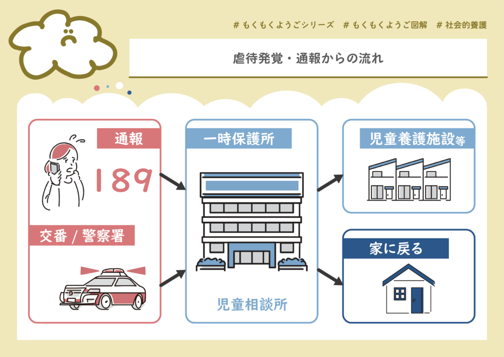 - 家にいることが危険と判断された場合は、「一時保護」という措置が取られ、家庭から離れて過ごします