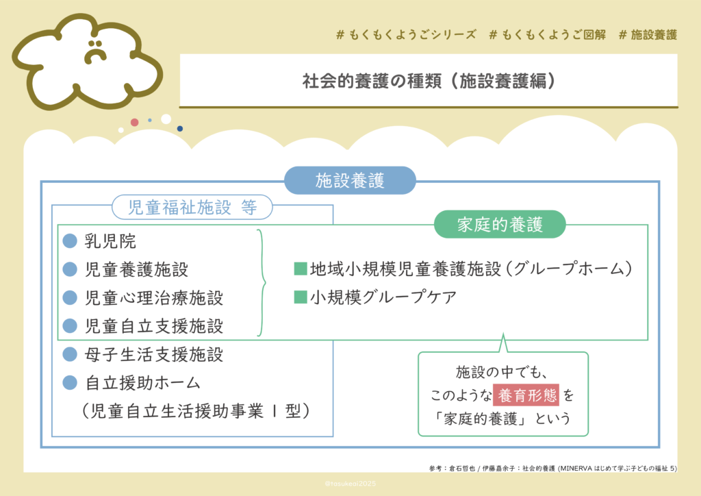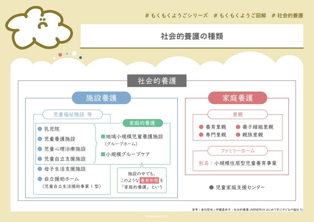 - 社会的養護には「施設養護」と「家庭的養護」・「家庭養護」に分けられる