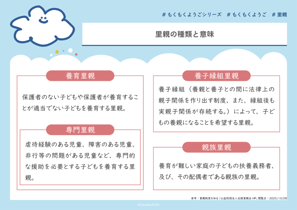 里親は養育里親・専門里親・養子縁組里親・親族里親の4つに分けられています。