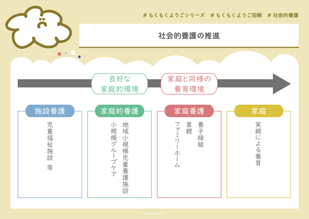 よって、上記の図のように、施設養護 < 家庭的養護 < 家庭養護の推進が行われていくことがわかります。
