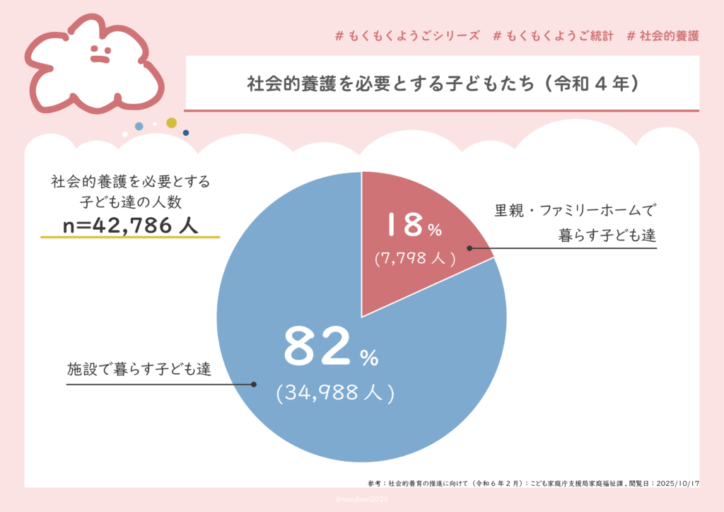 こども家庭庁発行の「社会的養育の推進に向けて(令和6年2月)」によると、児童養護施設や乳児院といった施設で暮らす子が82%(34,988人)、里親やファミリーホームで暮らす子が18%(7,798人)となっています。